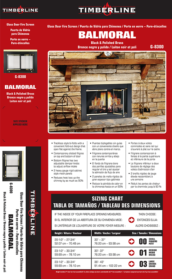 Glass door fire screen package label design (English/Spanish/French) – part of a large group of products. Products sold in US and Canada big box stores.